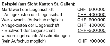 Der Nachteil des Aufschubs besteht darin, dass der Wertzuwachs beim Verkauf der Liegenschaft in Kantonen, welche das dualistische System (Einkommenssteuer / Grundstücksteuer) anwenden (z. B. Kanton St. Gallen) als Einkommen aus selbständiger Erwerbstätigkeit ordentlich besteuert wird. Bei jenen Kantonen, welche das monistische System anwenden (z. B. Kanton Zürich oder Thurgau), kommt die Grundstückgewinnsteuer zum Zuge.